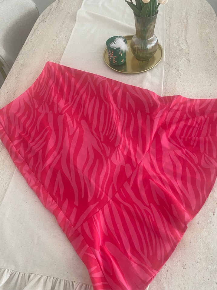 Pembe zebra desenli, volan detaylı kısa ve vücuda oturan mini etek. Pürüzsüz sentetik kumaştan, göz alıcı dış mekan kombinleri için uygun.