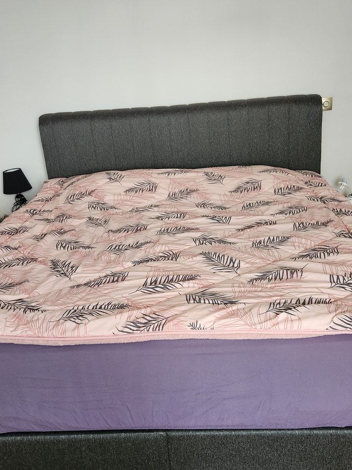 Pembe zemin üzerine gri pembe dal desenleri bulunan çift taraflı çift kişilik yorgan . Yorganın bir tarafı yumuşak peluş, diğer tarafı ise elyaf yorgan. İster elyaf yüzünü isterseniz peluş yüzünü kullanabilirsiniz. Ölçüleri 216 × 187 cm standart nevresim kullanılabilir Çift kişilik yorgan hediye geldi ama duruyor kullanılmadı.