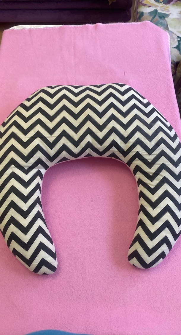 Pembe zeminde siyah beyaz zebra desenli emzirme yastığı, rahatlık sağlar.