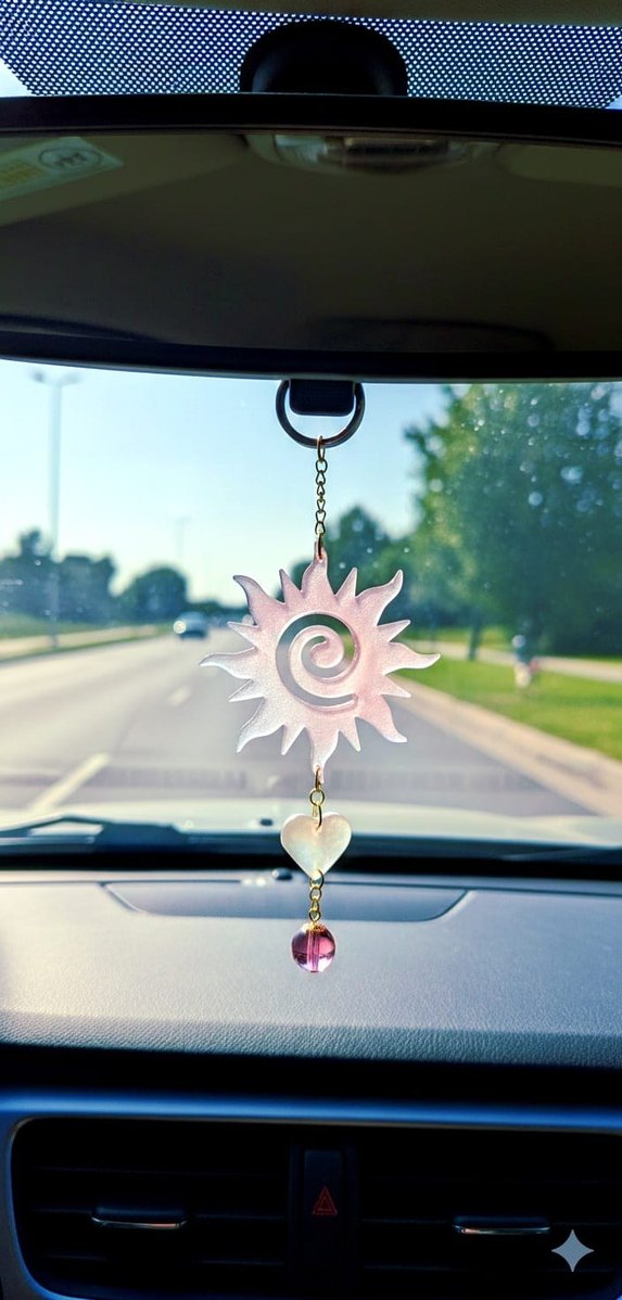 Pembe zincir detaylı, spiral desenli güneş, kalp ve pembe boncuklu bohem tarzda kadın charmı. Açık renkli, dış mekan havasına uygun.