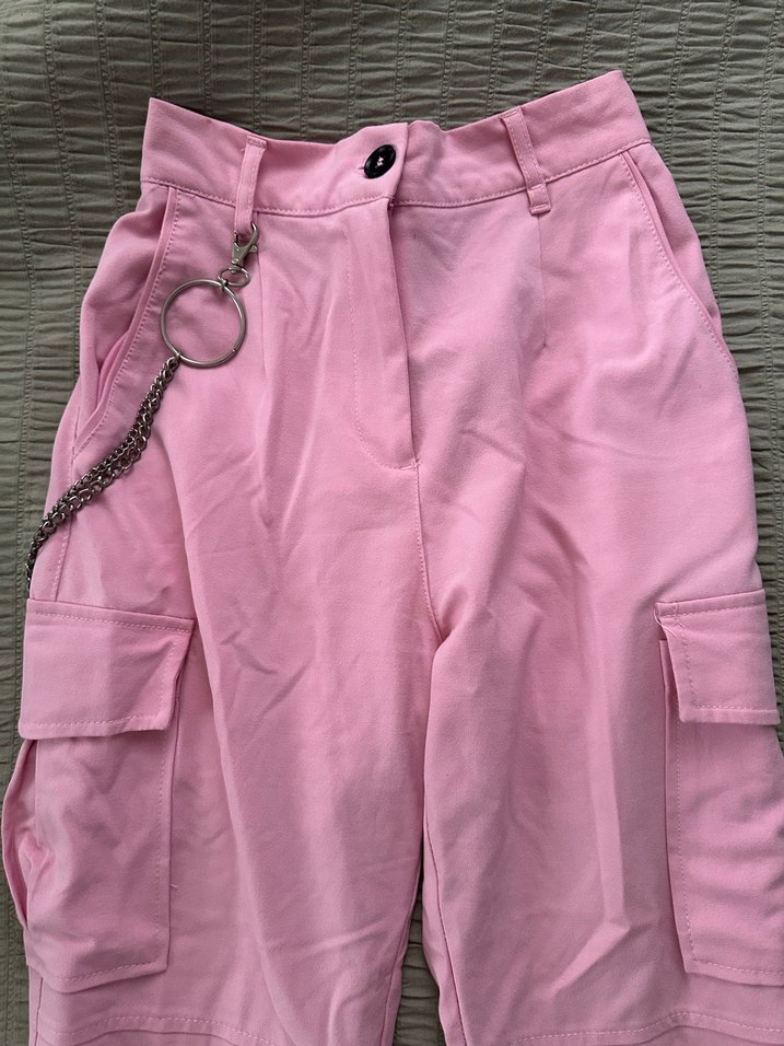 Yumuşak sentetik kumaştan yapılmış, zincir detaylı bol kesim pembe jogger pantolon. Günlük kullanıma uygun rahat sokak stili.