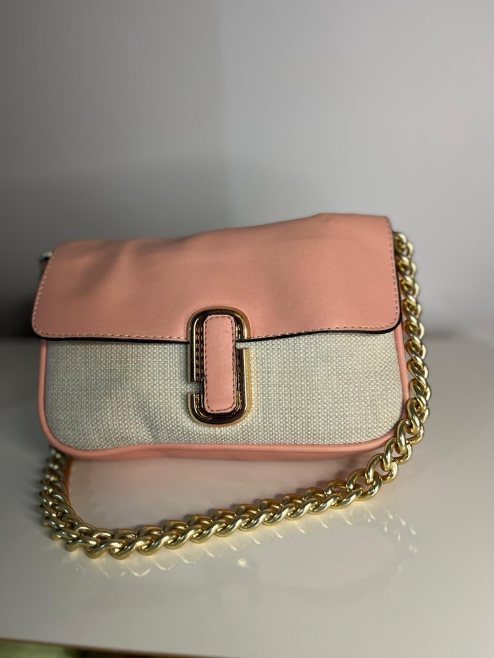 Pembe pastel sentetik kumaş ve altın zincir detaylı, modern klasik stilde kadın çantası, günlük kullanım için uygundur.