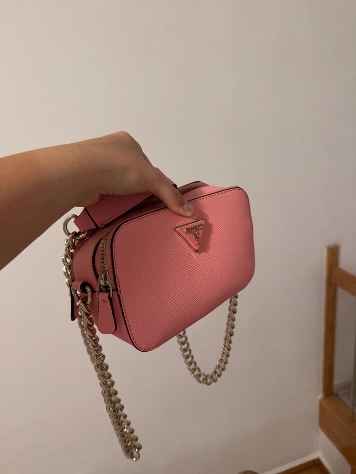 Pastel pembe renkte, zincir detaylı deri çapraz çanta, sade ve şık tasarımıyla günlük sokak modasına uygundur.
