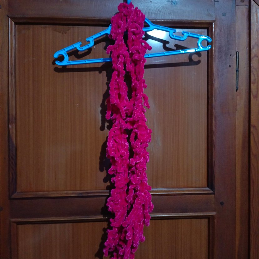 Canlı pembe renkte, zincir detaylı kadın örgü şal. Bohem ve avangart tarzıyla modaya yön verenler için uygun.