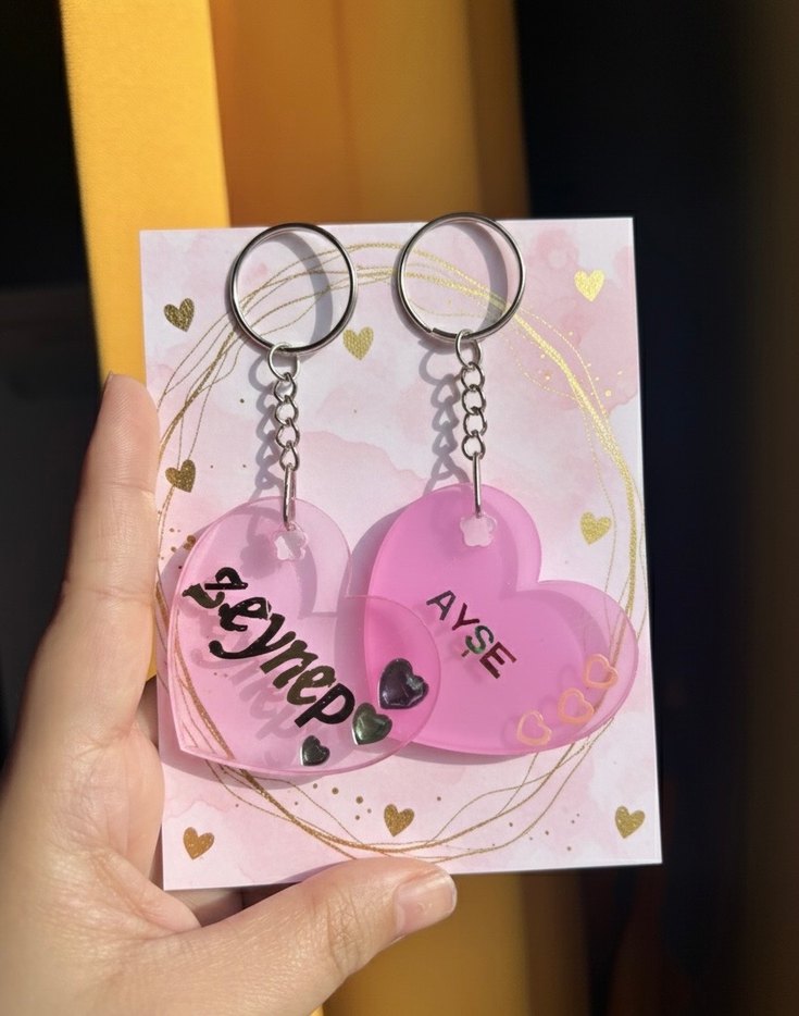 Pembe pastel tonlarında, zincir detaylı kalp şeklinde anahtarlık. Üzerinde "AYSE" yazıları bulunur. Sade ve şık tasarım.