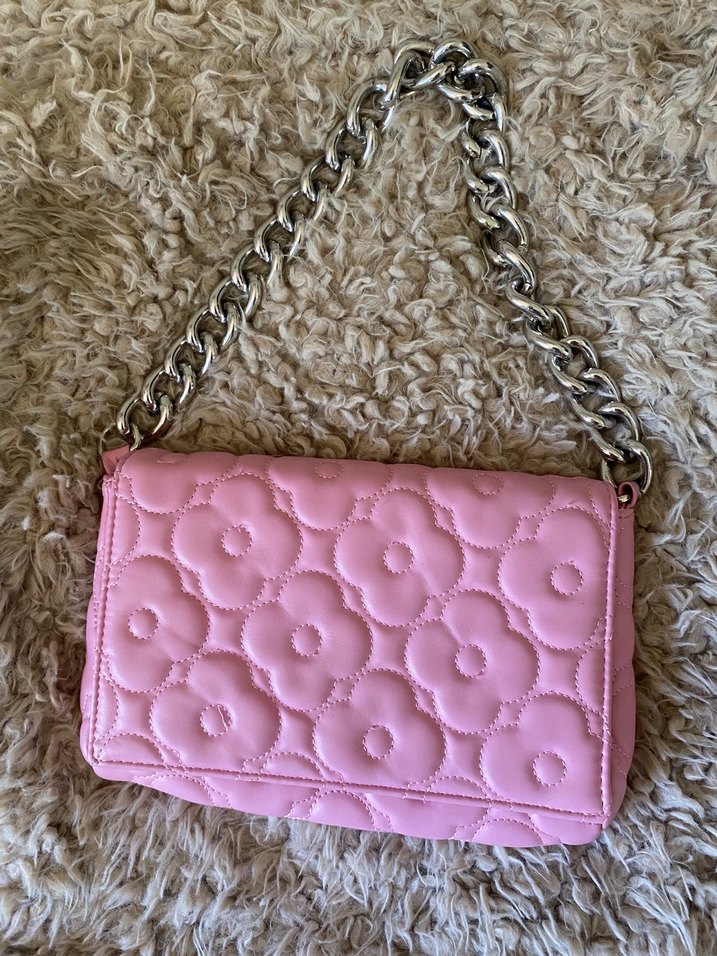Pastel pembe renkte, nakışlı çiçek desenli, yumuşak sentetik kumaştan yapılmış, zincir askılı kadın çantası. Günlük kullanım için uygun.