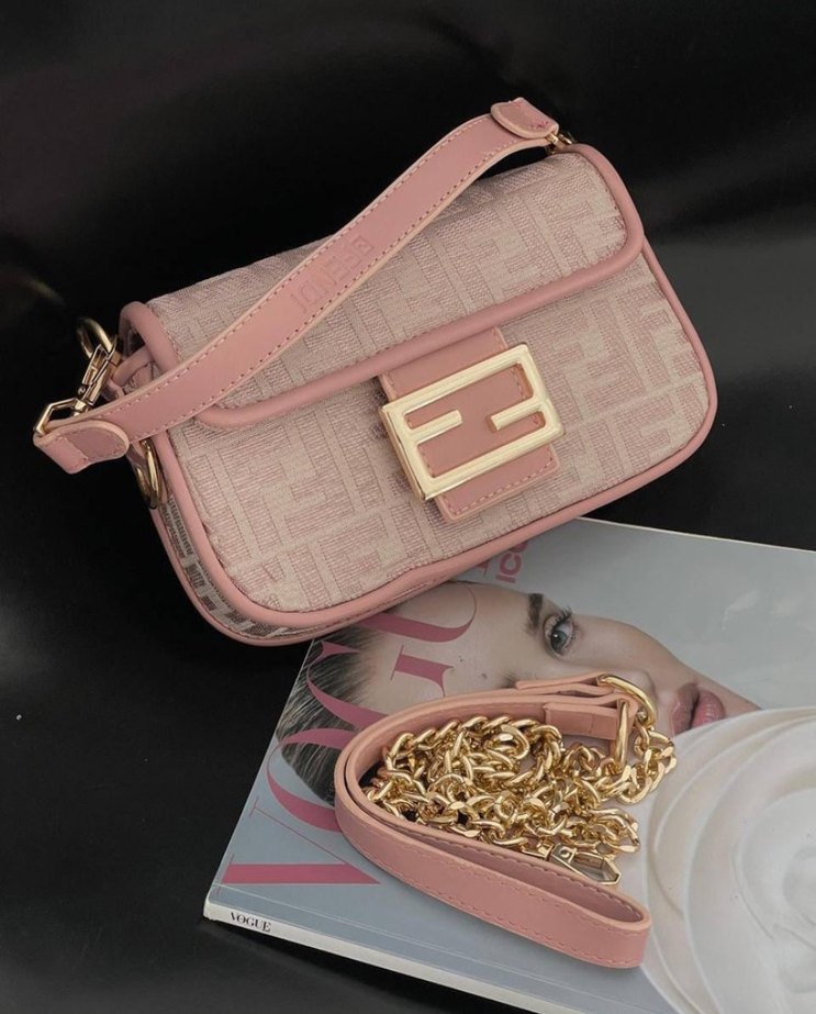 Pembe pastel renkte, zincir detaylı, baskılı sentetik kumaştan yapılmış kadın çantası, Parisian tarzda günlük şıklık için ideal.
