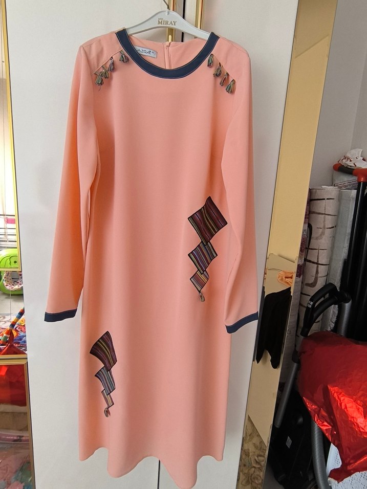 Pastel pembe renkte, uzun kollu, zincir detaylı ve nakış işlemeli kadın tunik. Sentetik kumaştan, regular fit kesimle günlük kullanıma uygun.