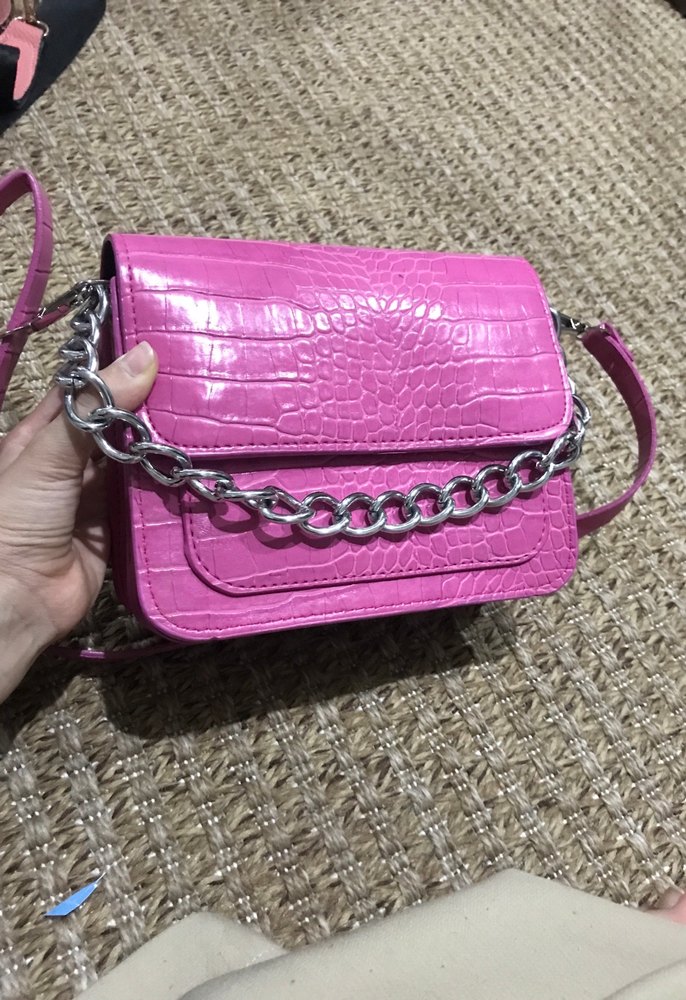 Pembe yılan desenli deri çanta, zincir detaylıdır ve trend sokak stiline uygundur. Renkli ve günlük kullanıma uygundur.