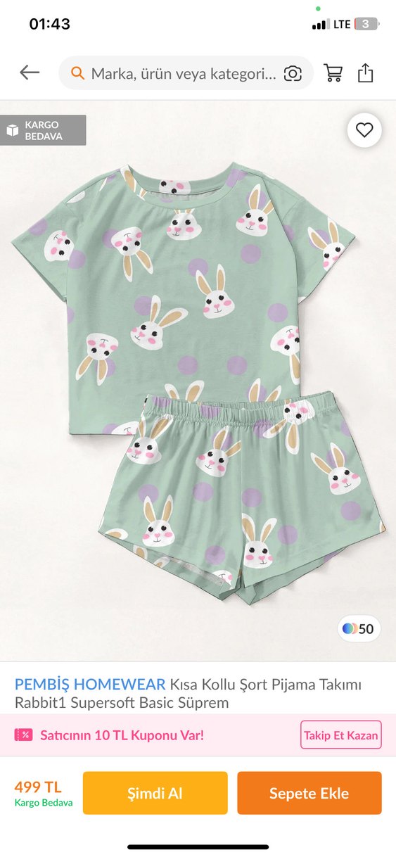Pastel yeşil renkte, tavşan desenli, kısa kollu ve bol kesim pijama takımı. Üstü kısa boylu ve yuvarlak yakalı, şortlu set.