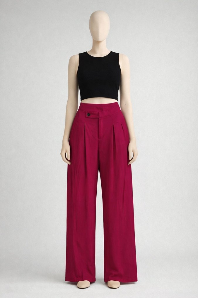pembe renkte, geniş paçalı kadın kumaş pantolon. Silky dokulu, desen içermeyen tasarımıyla zahmetsiz şıklık sunar. tencel kumaştır. hiç giyilmedi. marka temsilidir.