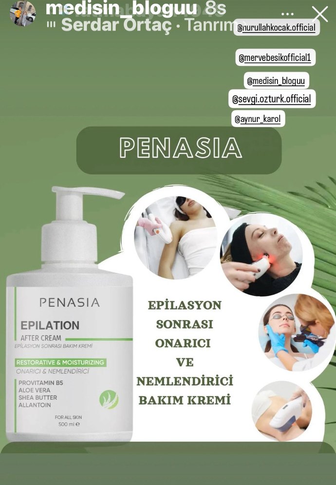 Penasia epilasyon sonrası onarıcı ve nemlendirici krem, allantoin, shea butter, provitamin B5 ve aloe vera içerir. Tüm cilt tipleri için uygundur.