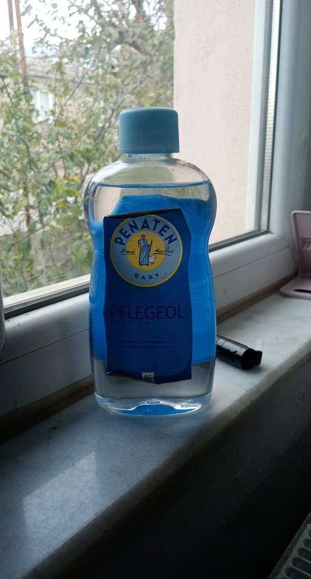 Mavi kapaklı ve etiketli şeffaf şişede Penaten bebek bakım yağı, nazik cilt bakımı için uygun.almanyadan alınmıştır bir sorunu yok