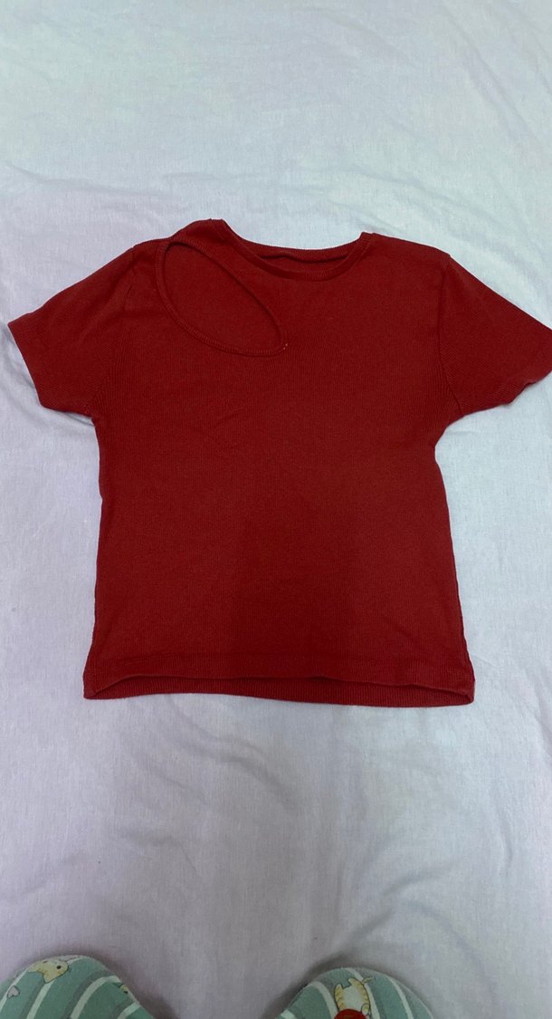 Koyu kırmızı renkte, kısa kollu ve bisiklet yakalı, yumuşak sentetik kumaştan yapılmış esnek kumaştır . Düz ve basic tasarımlıdır.