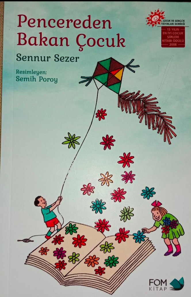Sennur Sezer'in yazdığı, Semih Poroy'un resimlediği 'Pencereden Bakan Çocuk' adlı çocuk kitabı, açık kitaptan uçurtma ve çocukların renkli çizimleriyle dolu.