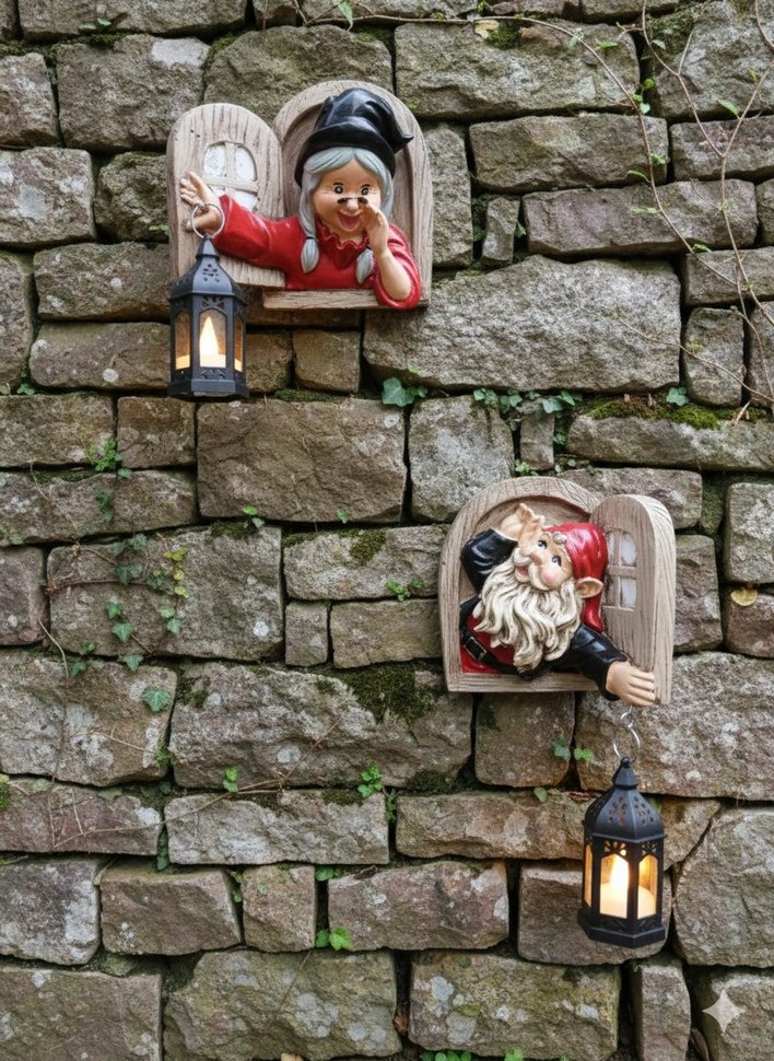 Kırmızı kıyafetli, pencereden bakan figürinler ve ellerinde küçük fenerler. Taş duvarda dekoratif bir hava yaratıyorlar. ♂️