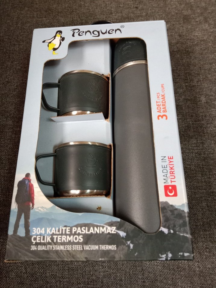Penguen markalı 304 kalite paslanmaz çelik vakum termos ve iki adet gri bardak içeren set. Türkiye'de üretilmiştir, içecekleri sıcak tutar ve dayanıklıdır. 1 kere kullanıldı