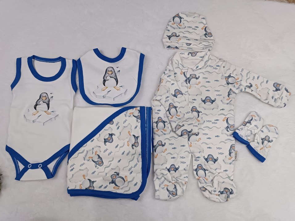 Penguen Desenli 5li Hastane Çıkışı ve Bebek Seti %100 Pamuk
