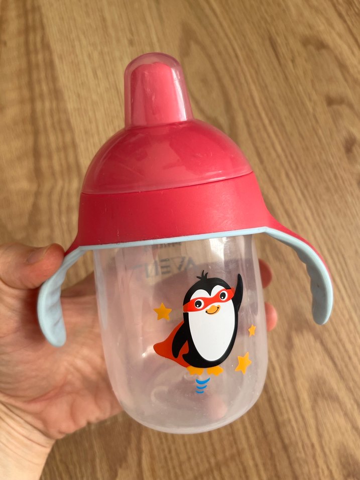 Pembe kapaklı, renkli penguen desenli bebek biberonu, kolay kavrama için kulpludur.