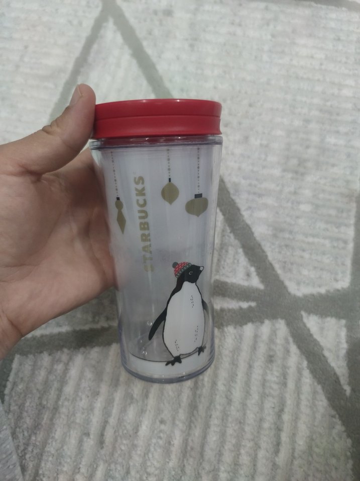 Bu Starbucks kupada penguen çizimi ve asılı süsler yer alıyor, kırmızı kapaklı ve şeffaf gövdelidir.