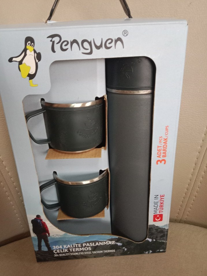 Penguen markasının gri renkli 304 kalite paslanmaz çelik termosu ve 2 adet bardak içerir. Dayanıklı yapısıyla ısıyı uzun süre korur. Türkiye üretimi. 1 kere kullanıldı