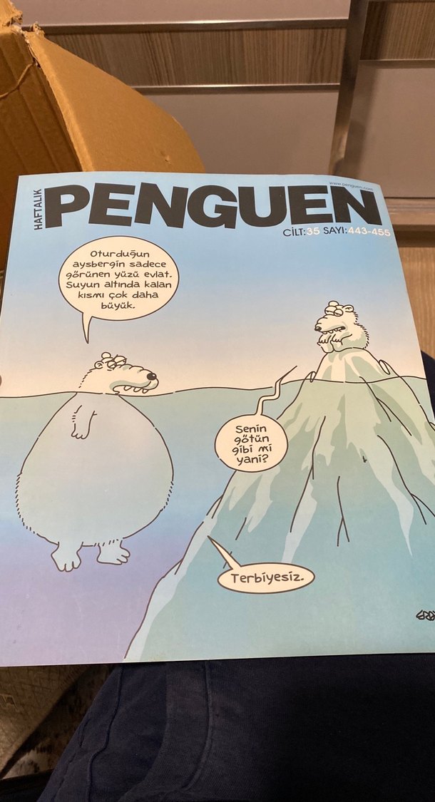 Penguen dergisinin bu sayısında, buzdağı ve ayı temalı esprili bir karikatür yer alıyor.