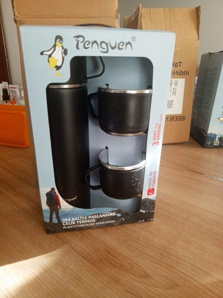 Penguen markalı siyah paslanmaz çelik termos ve kulplu iki bardaktan oluşan set. Dayanıklı ve kaliteli malzemeden üretilmiştir.