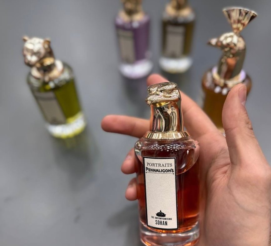 Penhaligon's Portraits koleksiyonundan Sohan, detaylı kapaklı şişede zengin amber renkli kadın parfümü. Markası ve kokusu etiketle belirtilmiş.