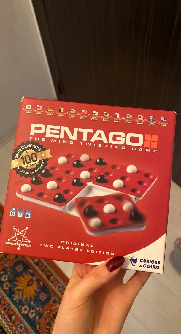 Pentago, dönen bölümleri ve siyah-beyaz taşları olan iki kişilik zeka oyunudur. Kırmızı kutuda, 8 yaş ve üzeri için uygundur.