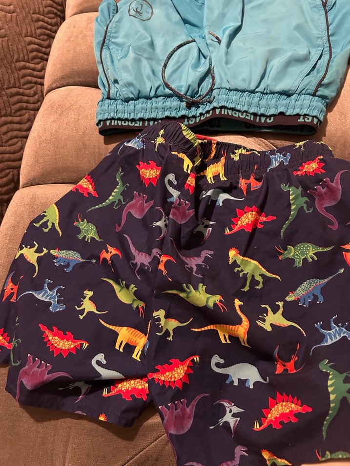 Erkek çocuklar için, koyu zeminde renkli dinazor desenli, rahat lastikli bel bantlı şort. 2-3 kez giyildi hiç bir defo tüylenme yırtık yok