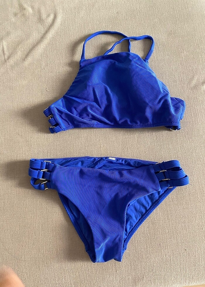 Az giyilmiş, 36 beden çivit mavi bikini takım. Göğüs pedleri mevcut ve hiçbir deformasyonu yoktur.