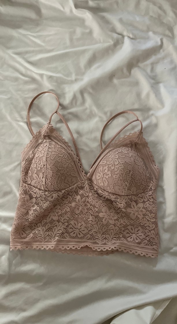 Bej renkte, ince askılı, yumuşak pastel tonlarda, dantel detaylı bohem tarzda kadın bralet.