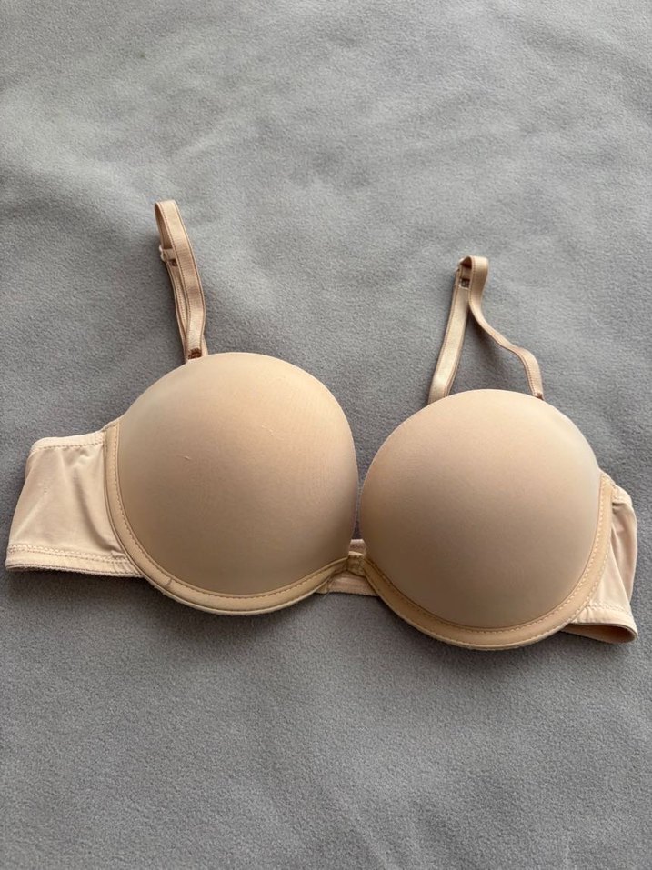 Bej renkli, minimalist tasarımlı ve düz dokulu sütyen. Ayarlanabilir askıları ve normal uzunlukta kesimi vardır. Teli hafif çıkmış durumda onun harici sıkıntı yok