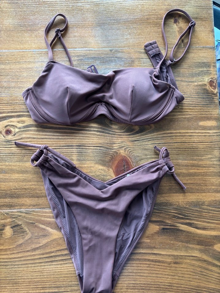 Kahve renkli, ince askılı ve vücuda oturan bikini, bohem tarzıyla plajda rahat ve şık bir görünüm sunar.