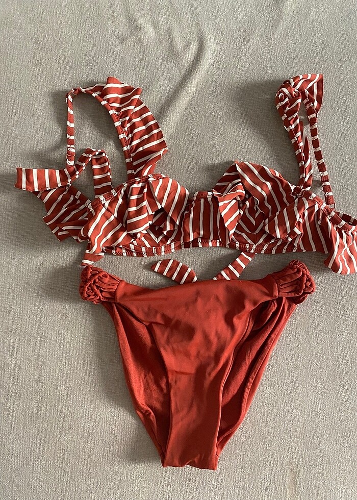 Penti 36 beden kendi takım yaptığım iki ürün. Kiremit renginde. Altını hiç giymedim ama ürün koruma bandını çıkarıp yıkamıştım. Üstü birkaç kez giyildi. Artık bedeni bana uymuyor. Hiçbir deformasyonu yoktur.