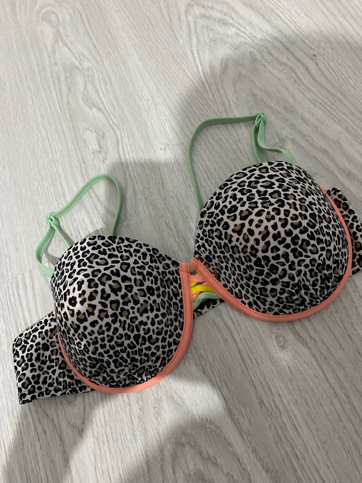 Leopar desenli, yeşil askılı ve turuncu detaylı renkli bikini üstü . 40 beden az sayıda kullanıldı .