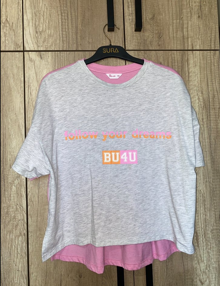 bol kesim gri tişört. Kısa kollu, yuvarlak yaka, pembe iç katman ve 'follow your dreams' baskılı, düğmeli detaylıdır.