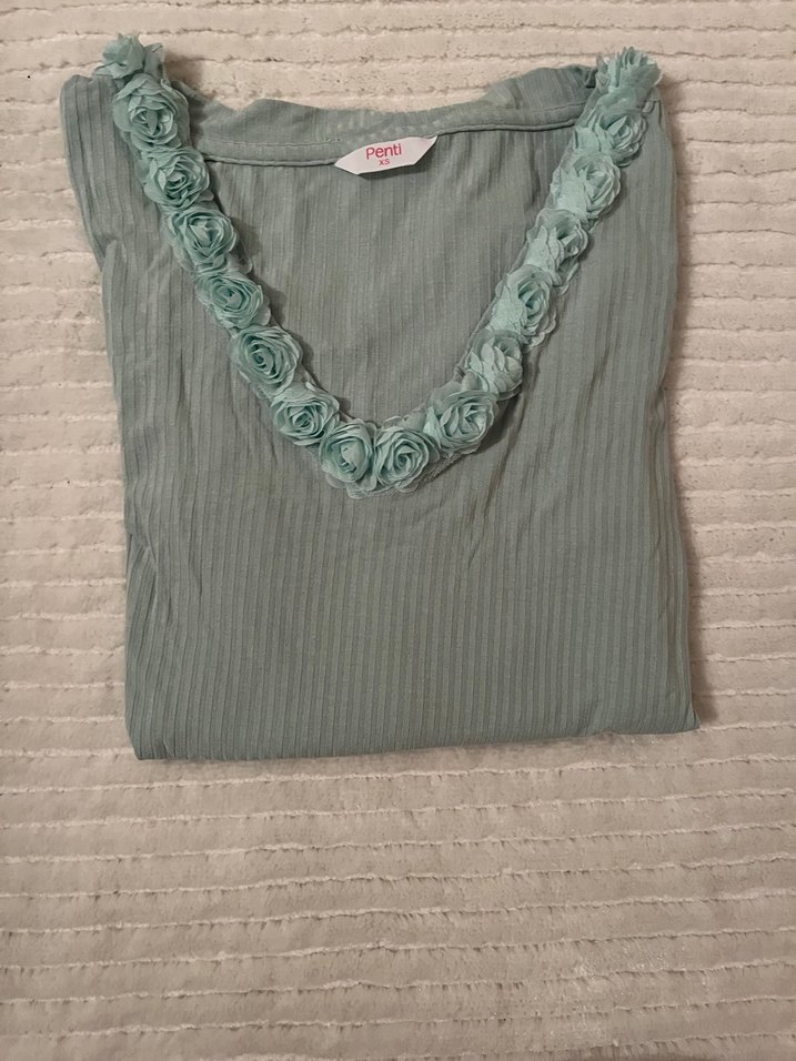 Bohem tarzda, keten kumaştan, uzun ve bol kesim hamile bluzu. Kayık yaka ve pastel renklerde fırfır işlemeli detaylar içerir.