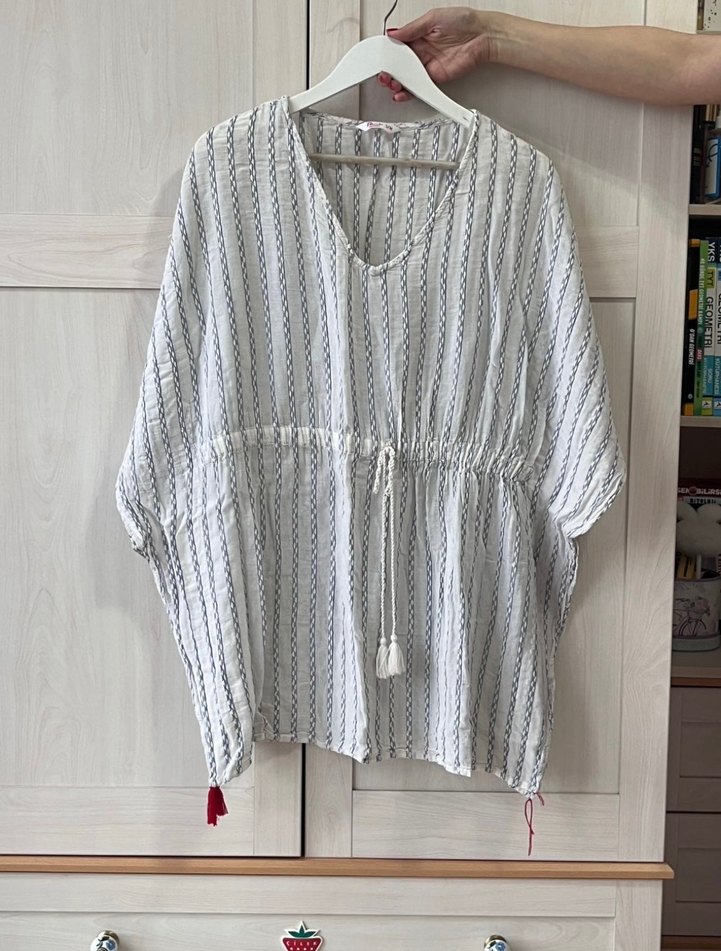 Pamuk kumaştan, salaş kesim ve V yakalı plaj pareosu Beyaz ve gri tie-dye desenli, püskül detaylı, midi boyda, bohem tarzda günlük kullanıma uygun.