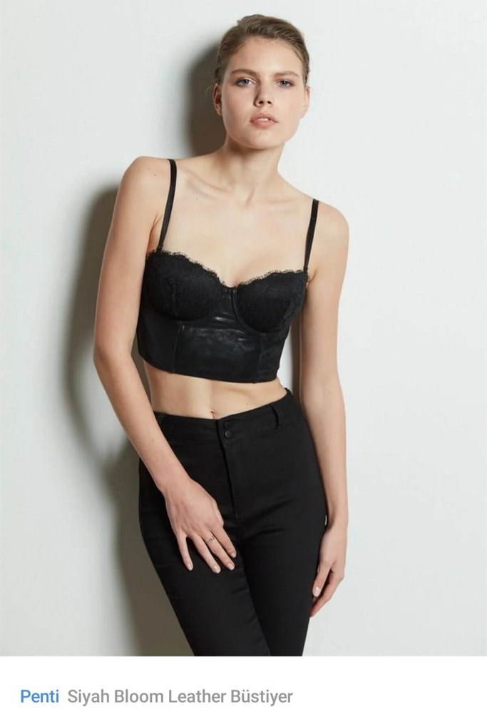 Siyah deri, straplez yaka ve askılı kollara sahip, vücuda oturan gotik tarzda bir büstiyer. Pentiden alındı 85B etiketlerini kopardim giyilmedi
