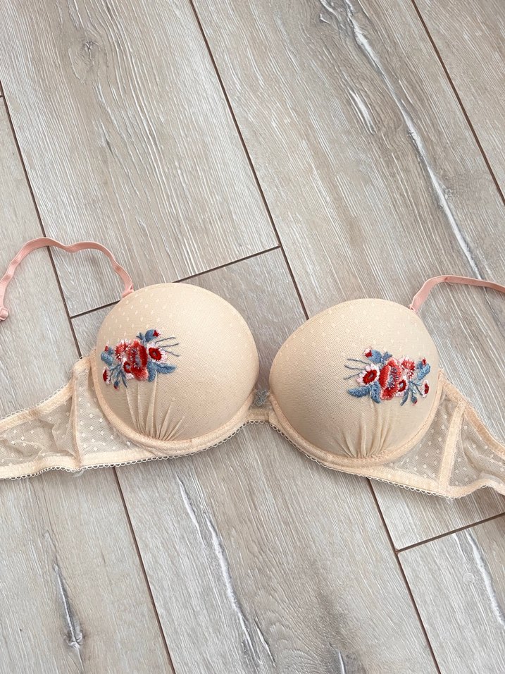 Hafif bej renkte, nakışlı çiçek detayları ve ince tül yanları olan, ayarlanabilir askılı vintage bohem tarzda sütyen. Temiz gönderilecektir!! Push-uplı üründür. 75A 75B düşünebilirsiniz