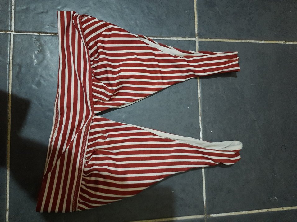Çizgili kırmızı ve beyaz çizgili, askılı ve yırtmaçlı, normal uzunlukta kadın mayo. Plajda kullanıma uygun, sokak modasına uygun tarzda. Bir-iki kez giyildi.