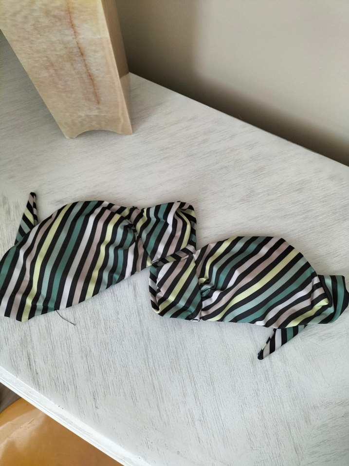 Çok renkli zebra çizgili, pilili ve ince askılı, kısa kesim mini bikini üstü, şık sokak stiline uygun.