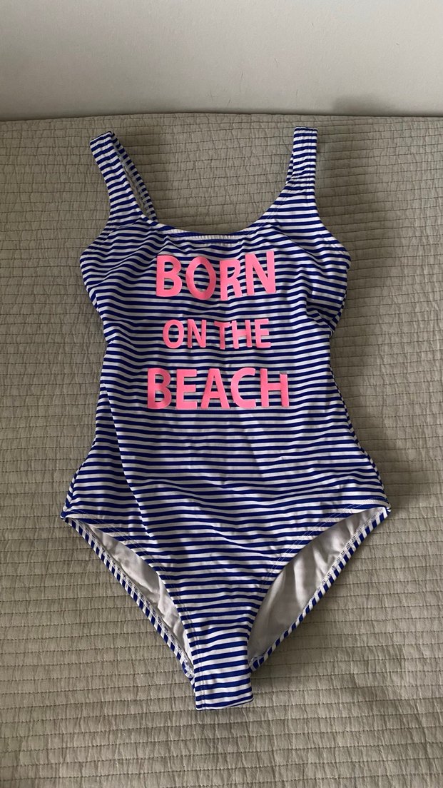 Renkli çizgili, yazılı ve tokalı, mavi kadın mayo. Omuzları açık, vücuda oturan kesimle plaj ve sokak stiline uygun. Etiketini kesmişim rahatsız ettiğinden penti ürünü taratabilirsiniz. Sayılı giyildi.