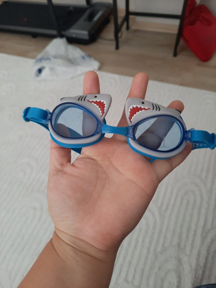 Mavi renkli, baskılı köpekbalığı desenli ve tokalı, plajda kullanıma uygun yüzücü gözlüğü.