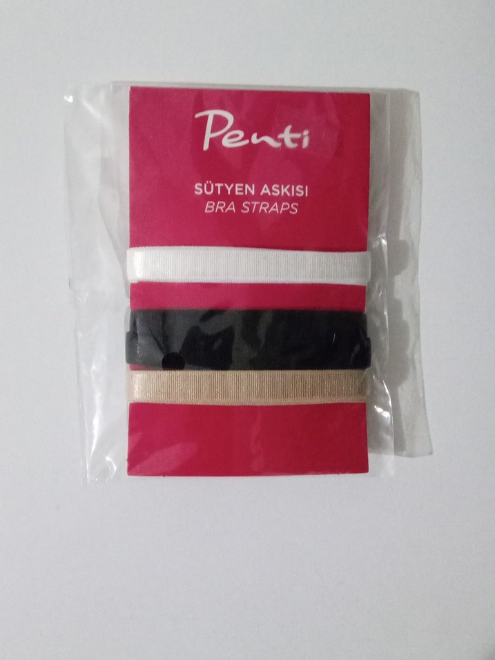 Penti markasına ait, koyu, bej ve beyaz renklerde üçlü sütyen askısı seti. Çok yönlü kullanım sağlar.