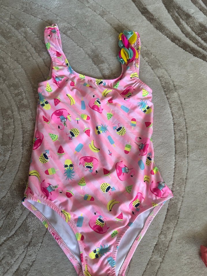Pembe renkli, çeşitli meyve ve dondurma desenleriyle süslenmiş, askılı kız çocuk mayosu, plaj için uygundur. Çok az kullanıldı.