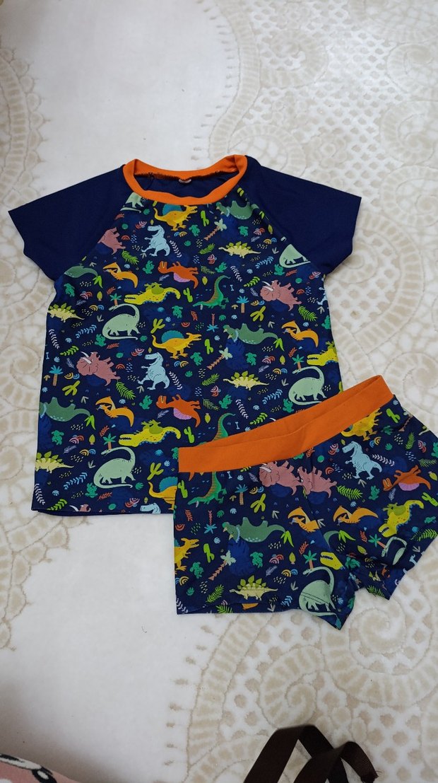 Kısa kollu, renkli dinozor desenli erkek çocuk mayo takımı, turuncu bel bandıyla yaz için uygun.