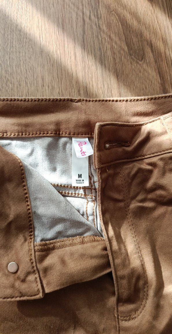 Penti, M beden, likralı, düğmeli ve yumuşak süet görünümlü kumaştan yapılmış,sütlü kahverengi parlak renkli, normal midi boyda, dar paça pantolon.