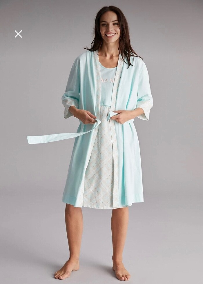 2 parça, gecelik + sabahlık. Hastanede giyildi. Gecelik S beden geniş kalıp. Sabahlık S/M beden. Hiçbir sorunu yok sadece ütüsüz. Not: Foto ekleyemedim ama sabahlıkta sağ alt köşede küçük bir sarı leke oluşmuş fındık tanesi büyüklüğünde. #penti #emzirmegecelik #gecelik #lohusa #hamile #sabahlık